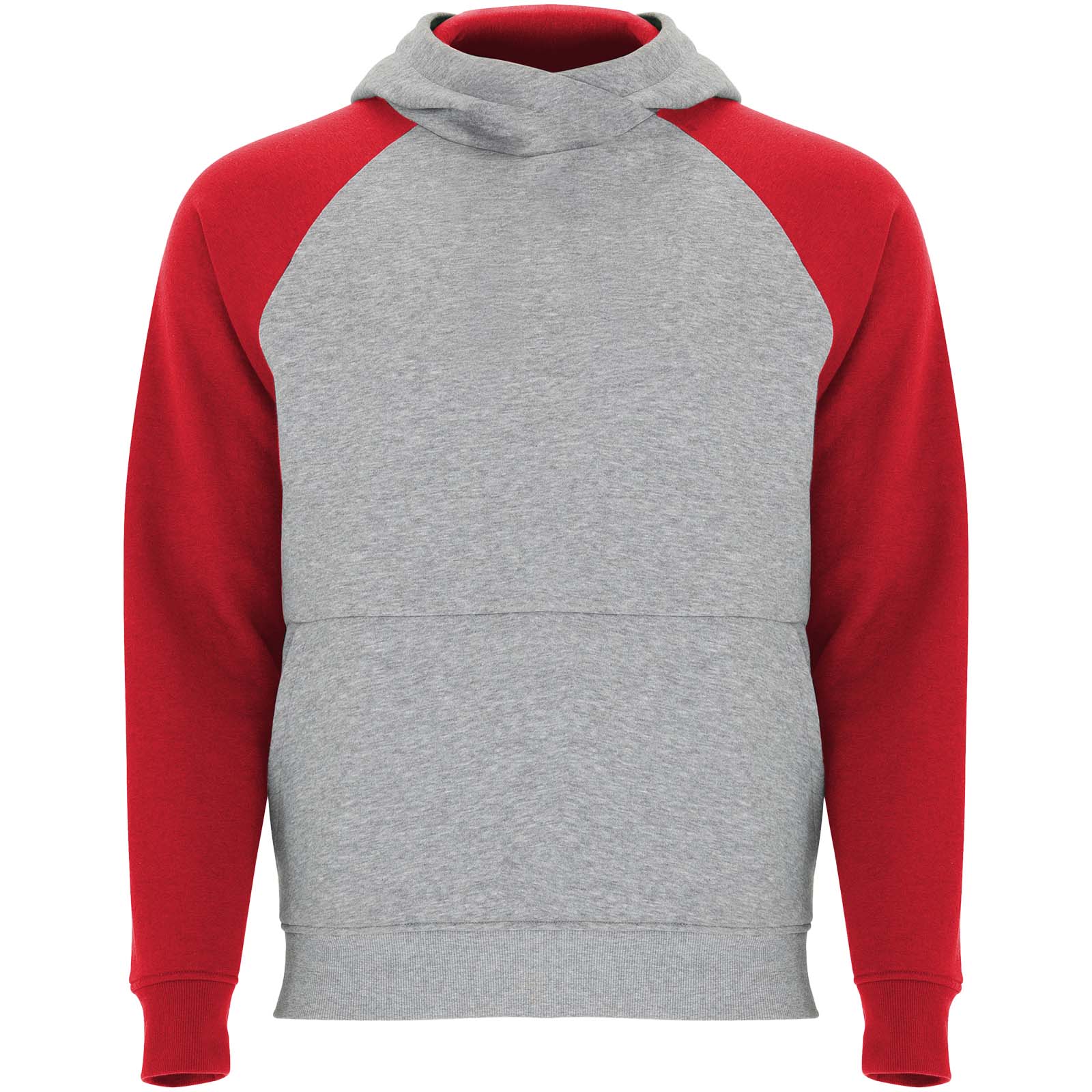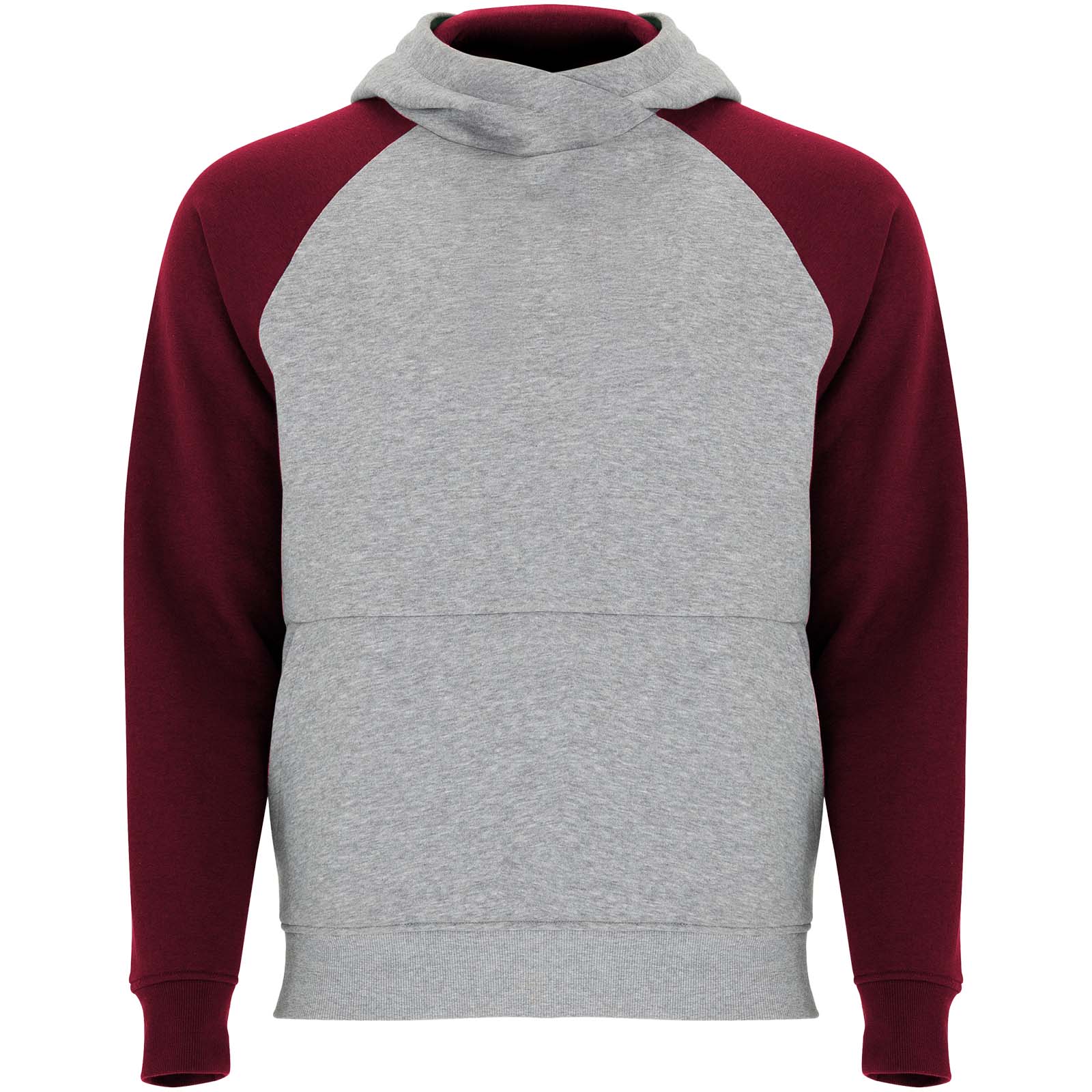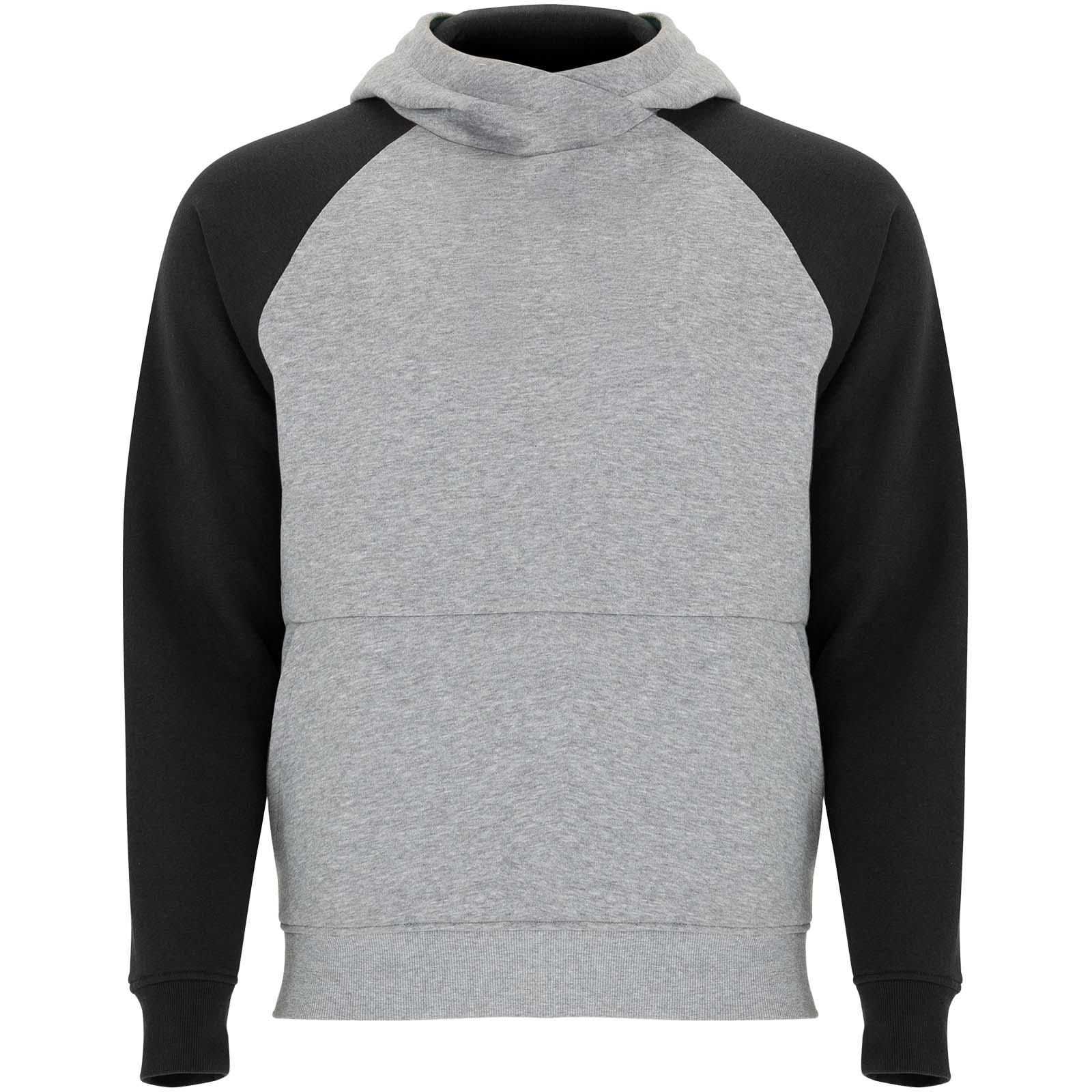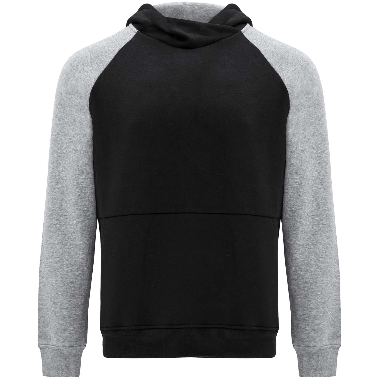 Tofarvet unisex-hættetrøje. Hætte med krydsende hals og metaløjer. indvendig hætte, snøre og raglanærmer i kontrastfarve. Kængurulomme. Manchetter og kant i 1×1 ribstrik af elastan. Aftagelig etiket.